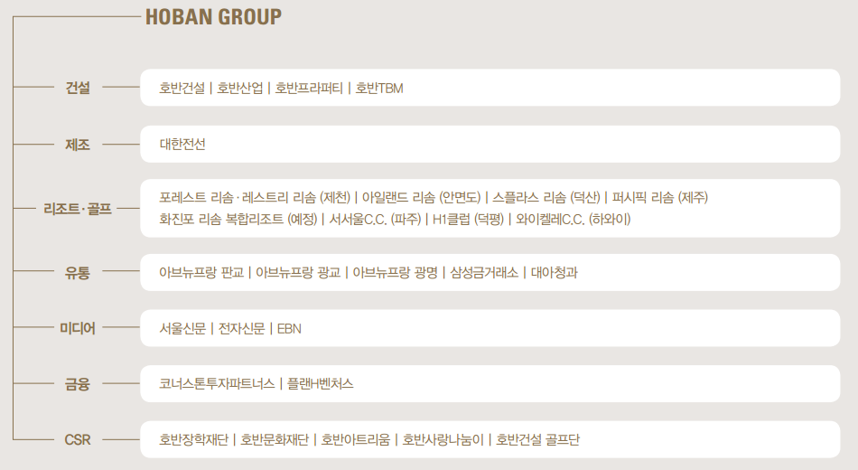 호반은 건설, 제조, 리조트, 골프, 유통, 미디어, 금융, 사회공헌 등